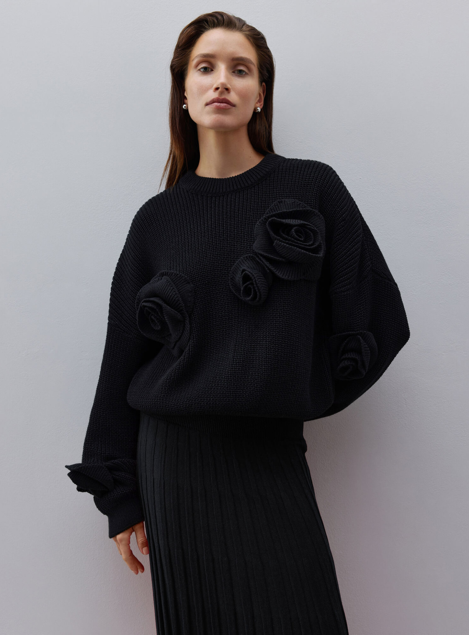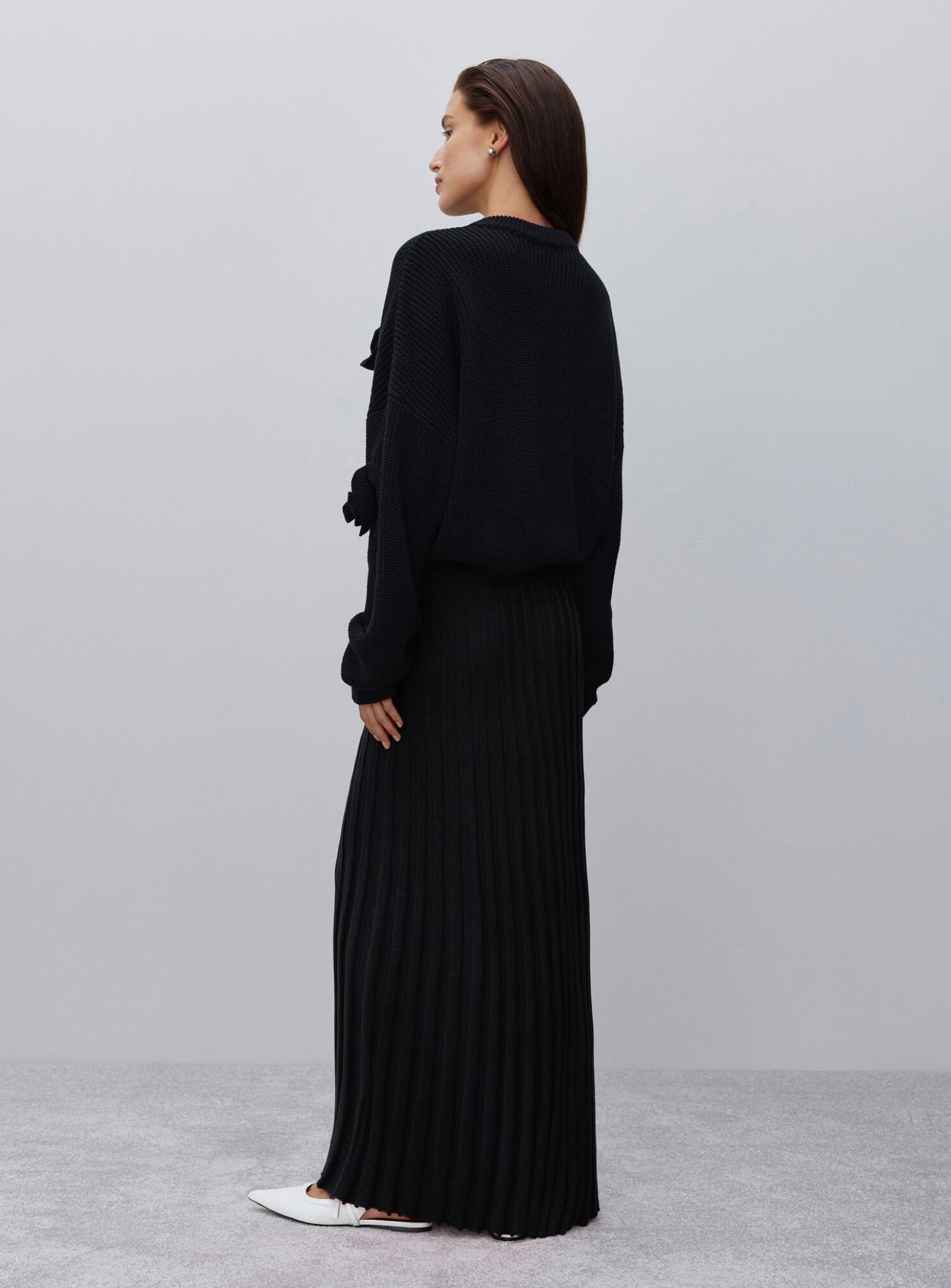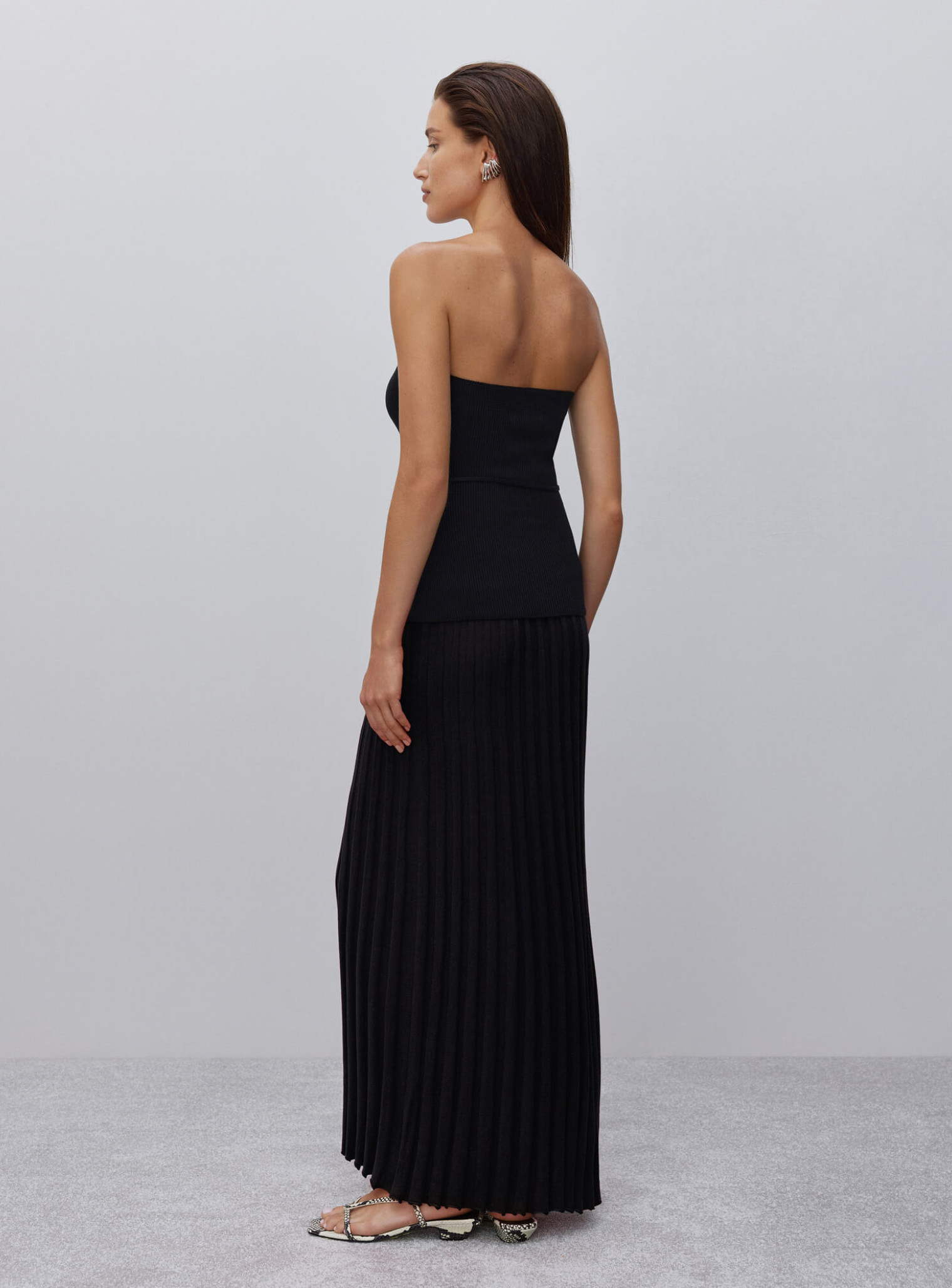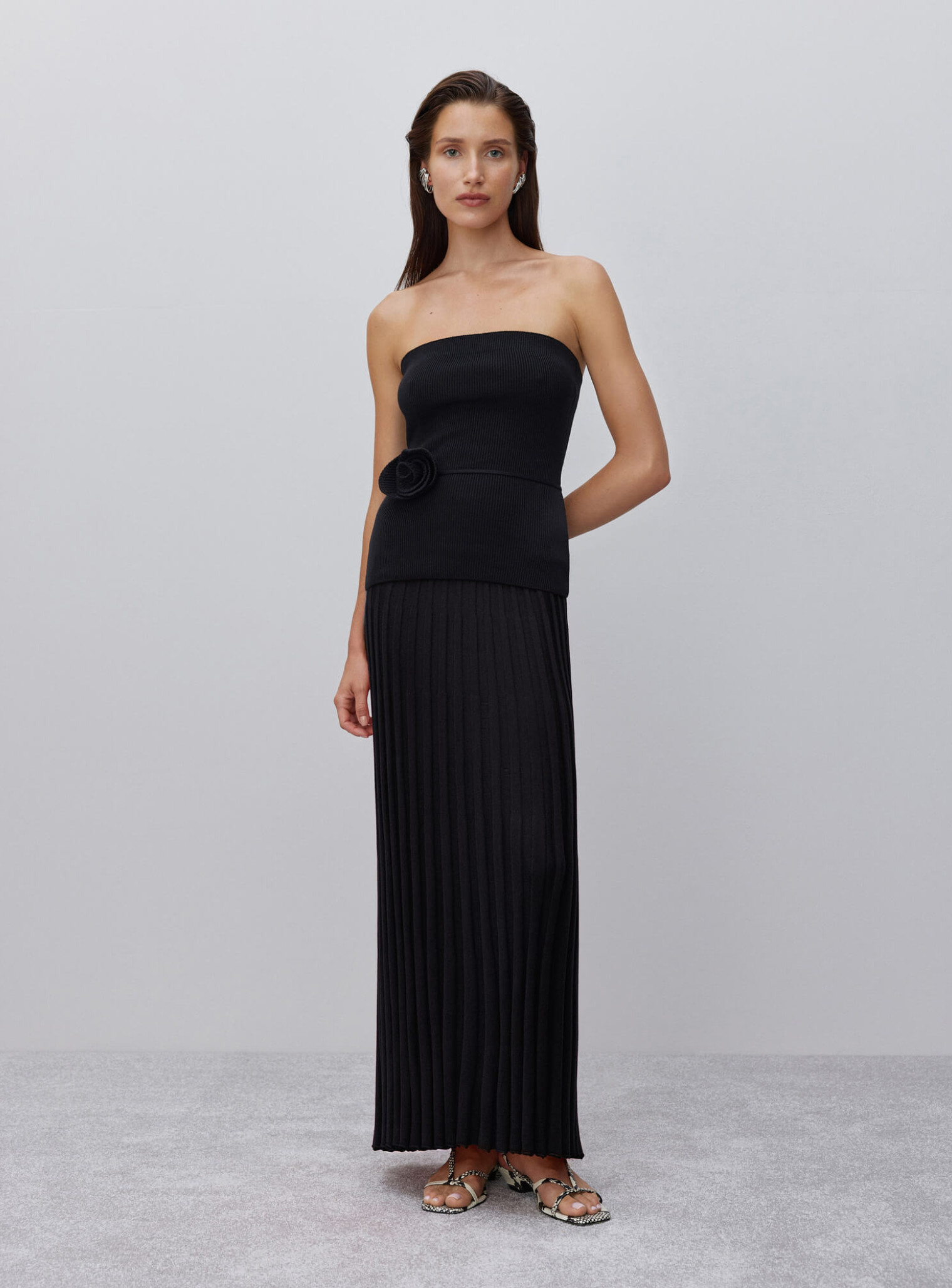 Юбка в длине макси с тонким и деликатным плетением гофре. Она плавно ложится по фигуре, а при движении плетения образует силуэт солнца. Верх юбки – это широкая плотная резинка прошитая спандексом, обладающая поддерживающим эффектом корсета. Покрой юбки позволяет носить ее на талии или опускать на бедра, изменяя стилизацию образа. Сочетается в комплект с топом в резинку.