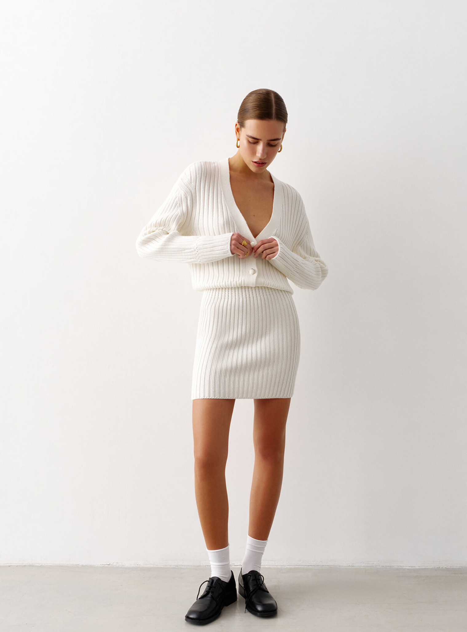 Актуальная юбка мини подчеркивающая силуэт – идеальный вариант придать нежности образам в холодное время года. Сочетается в костюме с кардиганом мини.