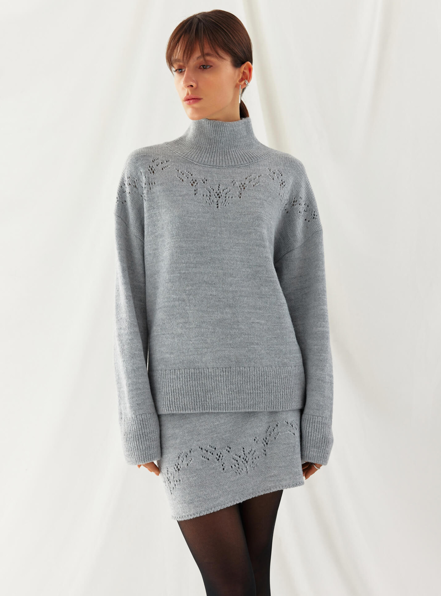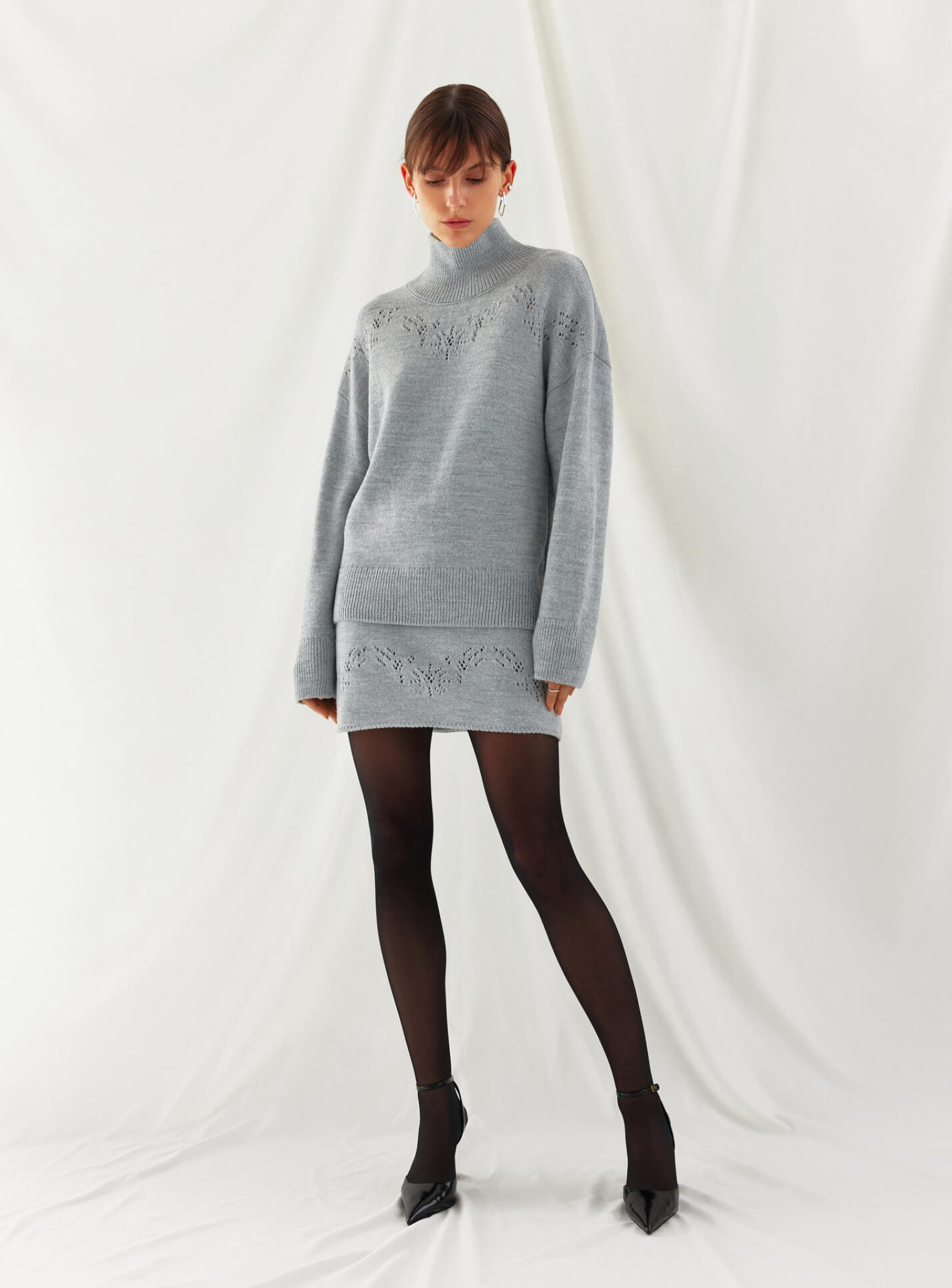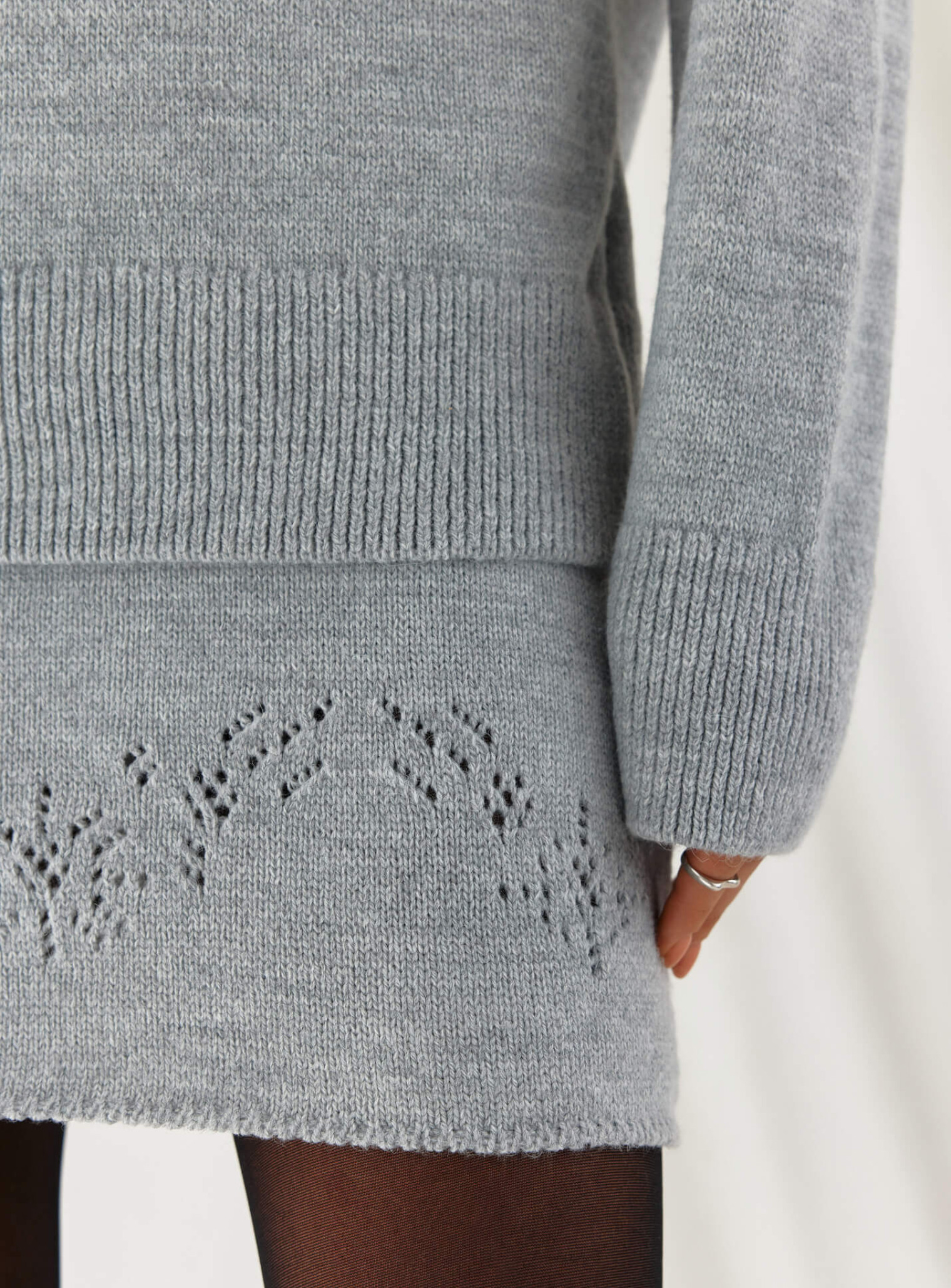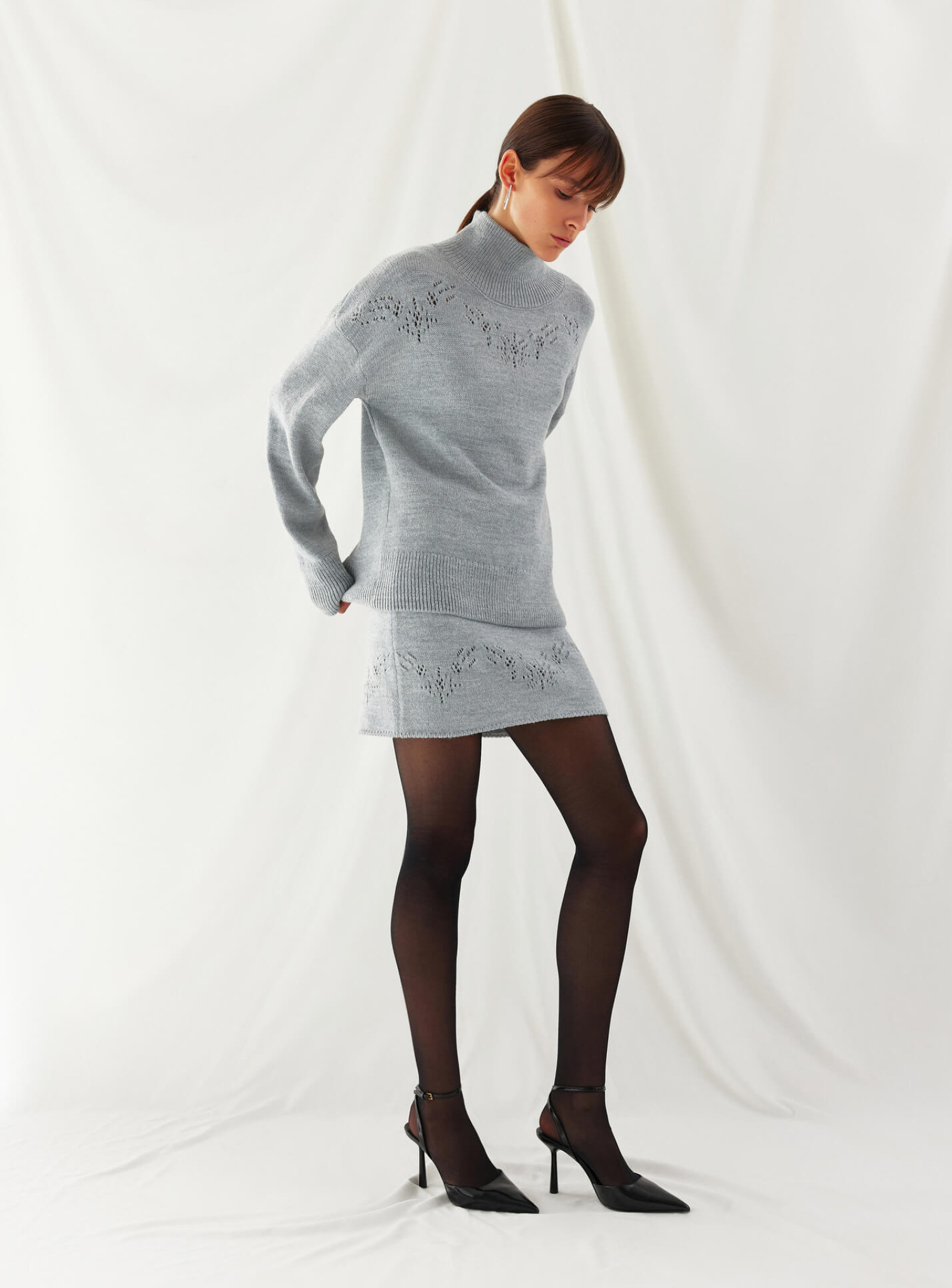 Трендовая юбка мини на средней посадке, выполнена из мягкой и нежной пряжи, плавно ложится по фигуре. Украшена деликатным ажурным узором по кругу, сочетается в стильный костюм со свитером с перфорацией.